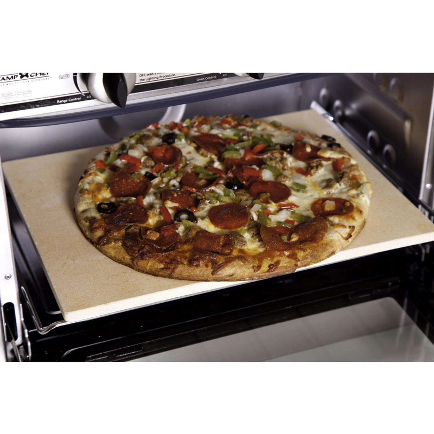 10.5″x14″ Ceramic Pizza Stone The Camp Oven Pizza Stone will cook the perfect pizza anytime, anywhere. Made of Cordierite ceramic fire brick, the Pizza Stone absorbs excess moisture and evenly distributes heat to give a light, crispy, golden brown crust. Cook like the pros where ever you go. Great for calzones too! It fits perfectly in any Camp Chef Camp Oven, most Camp Chef Professional Barbecue Boxes and works great in your home oven. Out of the box ready to cook in seconds Ceramic pizza stone pulls outer moisture off dough and promotes perfect crust leaving the inside moist and fluffy Stone holds heat to help stabilize oven temperature for perfect pizza