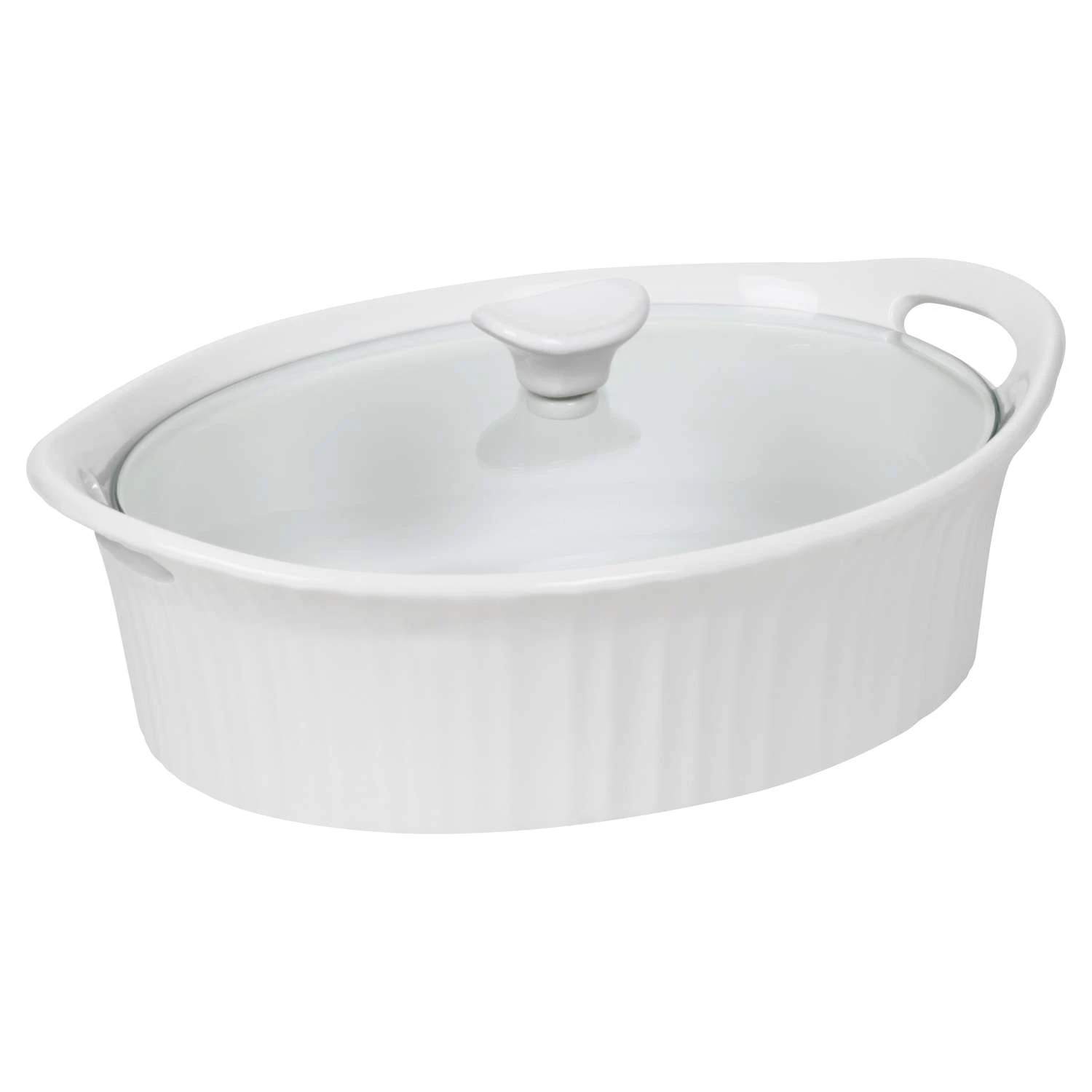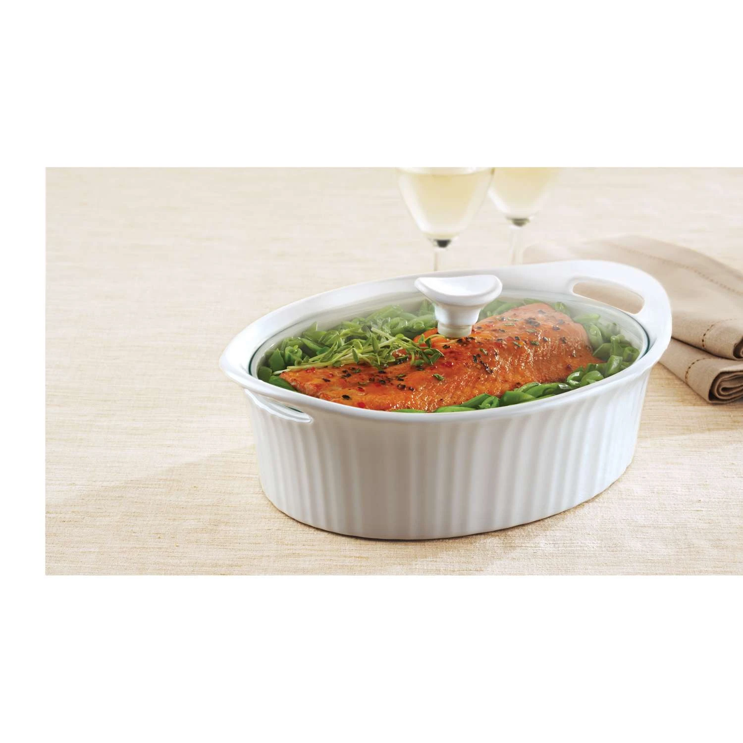 The lid on this French White® casserole does double duty. During cooking, it keeps moisture and flavor in the casserole. On your table, it keeps food hot and lets everyone see what’s inside – without lifting the lid. Baking dishes oval casserole glass cover cap Stoneware is oven, microwave, refrigerator, freezer and dishwasher safe Resists chipping and cracking Non-porous surface does not absorb food odors, flavors or stains