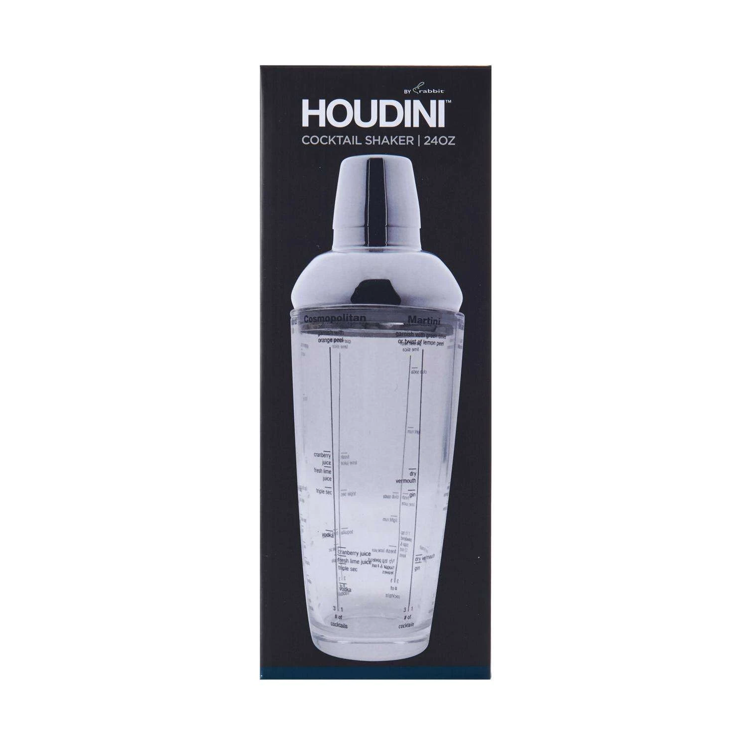 The Houdini 24oz Glass Cocktail Shaker is a must have for any well stocked bar or kitchen. This all in one shaker includes strainer, jigger and six popular recipes. The shaker is made of crystal clear glass so you can measure accurately while the innovative seal bonds the glass and strainer to prevent leaks. Shake it up! Whether you are an at-home mixologist or an amateur wine connoisseur, Houdini by Rabbit provides exceptional tools to inspire you to celebrate the moments. Like Rabbit, Houdini is continually evolving and takes pride in delivering quality and value at an everyday price point. Never worry about mixing up the perfect cocktail recipes are on the glass No need for a jigger, measuring cup or shot glass with essential step-by-step recipes Easy to clean, hand washable