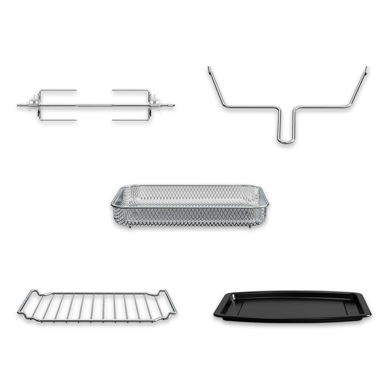 | What's Included | Enamel Baking Tray And Stainless-Steel Oven Rack, Air Fry Basket, BBQ-Style Rotisserie Spit and Forks and Lift Tool |