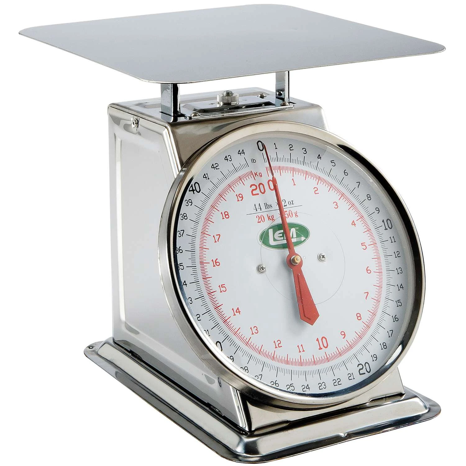 Take advantage of this large, heavy duty stainless steel scale that weighs items up to 44 lbs. The scale has a large 8 inch dial and measures pounds in 2 oz. increments or kilograms in 50 gram increments. Sturdy stainless steel base supports a large 9-1/2 inch x 9-1/2 inch stainless steel platform. Sturdy stainless steel base. weighs up to 44 lbs. 8 inch dial measures pounds in 2 oz. increments or kilograms in 50 gram increments. 9-1/2 inch x 9-1/2 inch platform.