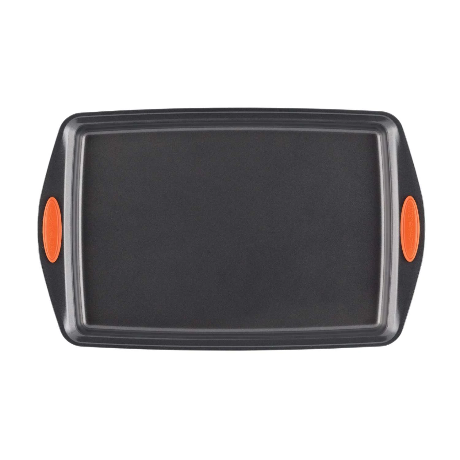 From crisp oven fries to a fast batch of chocolate refrigerator cookies, this Rachael Ray Yum-o! Nonstick Bakeware 10-Inch by 15-Inch Oven Lovin’ Crispy Sheet Cookie Pan is perfect for both savory and sweet dishes. The nonstick bakeware is made from heavy gauge steel that can bake over and over with the same great results. Offering sturdy construction and convenience, this Rachael Ray bakeware resists warping, is oven safe to 500°F and has grippy handles to provide a confident grasp when pulling items from the oven. For easy cleanup, it also has long-lasting nonstick for excellent food release. As an added bonus, a portion of the proceeds from this purchase goes to Yum-o!, Rachael’s nonprofit organization that helps kids and their parents develop healthy relationships with food and cooking. This versatile cookie pan is the perfect complement to the rest of Rachael’s bakeware and cookware collections that always spell fun in the kitchen.Bake roasted vegetables and other savory and sweet treats and have fun doing it with the Rachael Ray Yum-o! Nonstick Bakeware 10-Inch x 15-Inch Oven Lovin’ Crispy Sheet Cookie Pan. Fun orange silicone grips This nonstick cookie pan is made from heavy gauge steel for everyday use; sturdy construction resists warping Long-lasting nonstick promotes excellent food release Grippy cookie pan handles offer a confident grasp; oven safe to 500 degrees Fahrenheit A portion of proceeds goes to Yum-o!, Rachaels nonprofit organization that helps kids and their parents develop healthy relationships with food