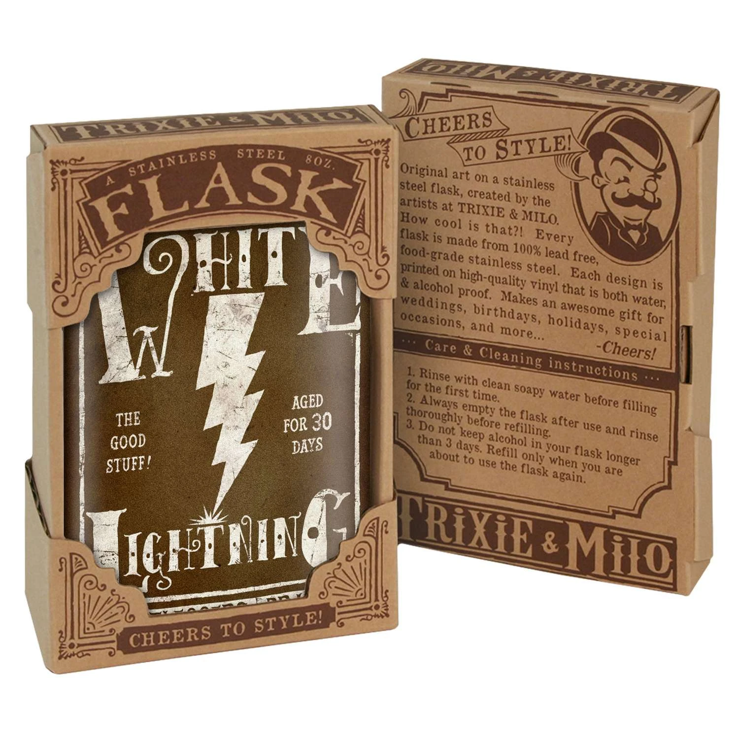 Hide your hooch just like they did in the old days with our trusty White Lightning flask. Whether for your own personal use or as a gift, it’s a classic! Cheers to style! Original art on a stainless steel hip flask; created by the artists Trixie & Milo – how cool is that? Every flask is made from 100 percent lead free, food-grade stainless steel. Each design is printed on high-quality vinyl that is both water and alcohol proof. These flasks make an awesome gift for weddings, birthdays, holidays, special occasions and more. Image label is protected by a layer of high gloss liquid enamel laminate and baked on at 200 degrees; this means it will last a long time Ships in a handy gift box, perfect for wrapping and read to gift Wash in soapy water, rinse clean and wipe down with a soft cloth to dry